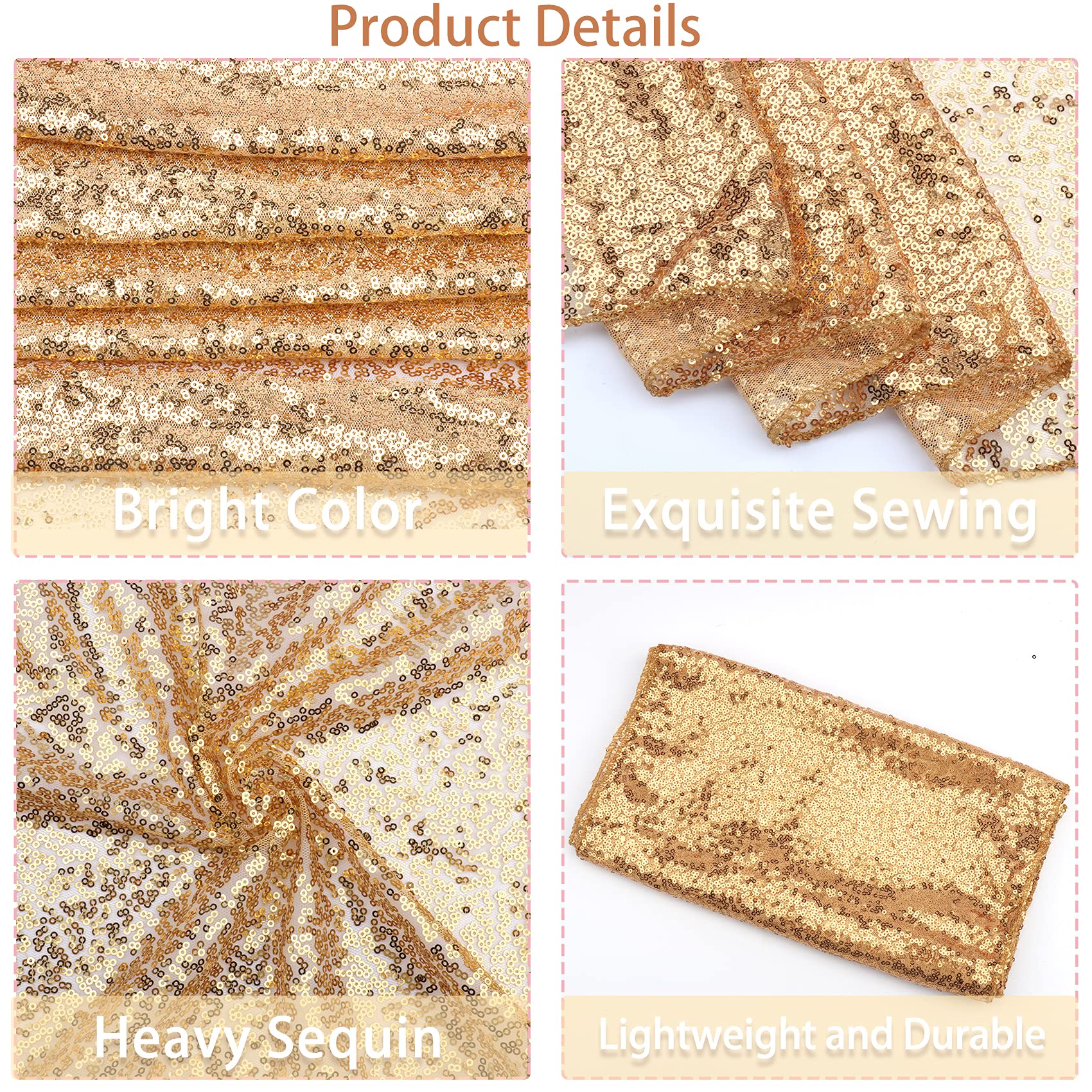 - High Quality Material: The gorgeous sequin table runner made of high quality polyester and sequins, lightweight, exquisite sewing, sturdy and no creases. 3mm glitter round sequins sew tightly on the mesh fabric, all sides are locked with folded edge. The special material may cause a few sequins fall off for the first use, just shake the sequins off.