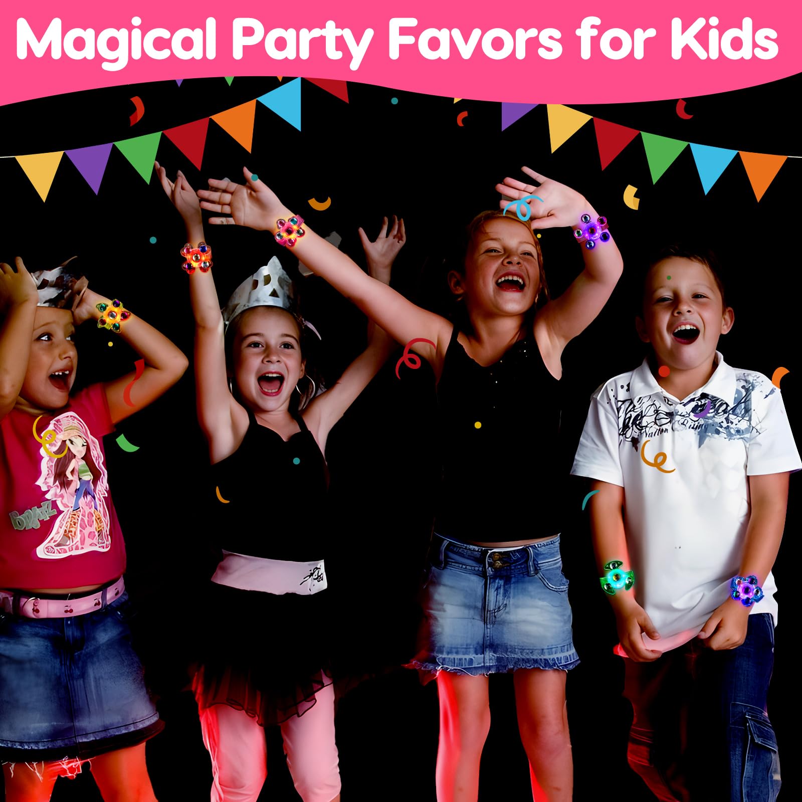 - 【Funny Glowing Fidget Toys Bulk for Kids】The light up party favors for kids are a combination of bracelets, led and fidget toy all of which are loved by kids. Spinning and lighting can break away from troubles, relieve anxiety, and release pressure to some extent. More fun & less pressure! Great graduation party favors, fidget Valentine toys for kids class, easter egg hunt supplies, treasure box toys, goodie bags stuffers for teen boys girls!