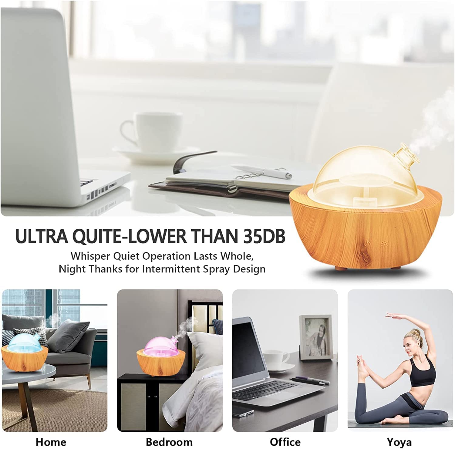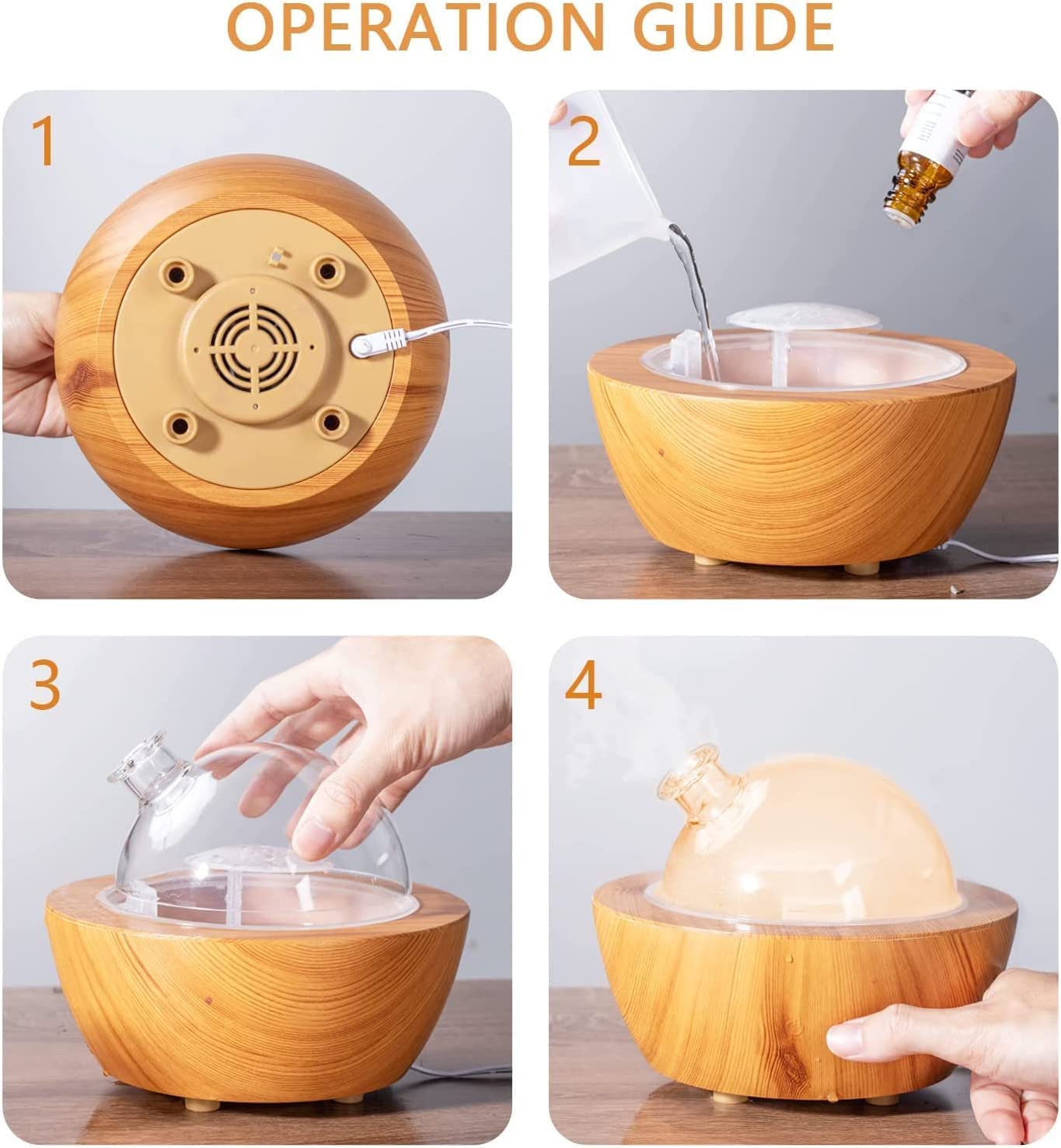 - Handmade Glass Aromatherapy Humidifier-280ml ultra-modern dark imitation wood grain essential oil diffuser,Handmade contemporary style glass cover. The unique look perfectly to match any decorative style.Use it to improve your home's air and atmosphere quality, cover the smell of pets or smoking, and protect you family from excessively dry air, microorganisms, allergens, dust, and more!