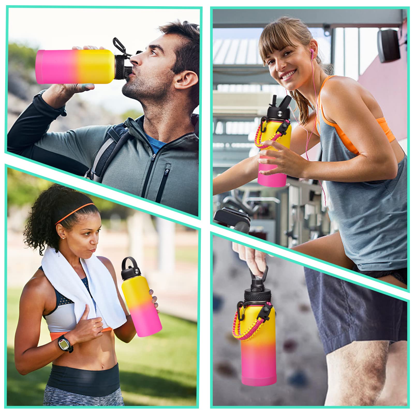 - SUPER JOYFUL COMBO: Buy 32oz insulated water bottles and get 9 accessories (2 x lids, 1 x survival paracord, 1 x carrying pouch, 1 x shoulder strap, 1 x protective cup mat, 2 x straws, 1 x straw brush). WITH A LIFETIME GUARANTEE, these thermal water bottles are perfect gifts for using at home, work, school, road trips, hiking, sporting events, or just hanging out