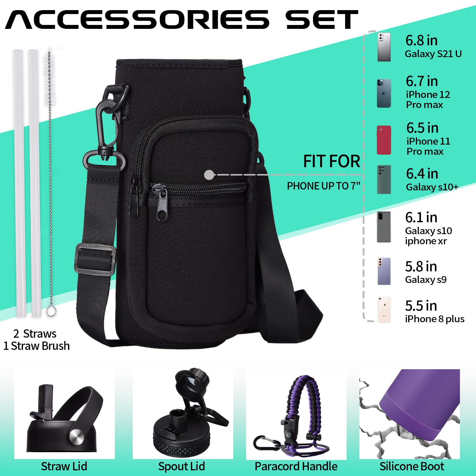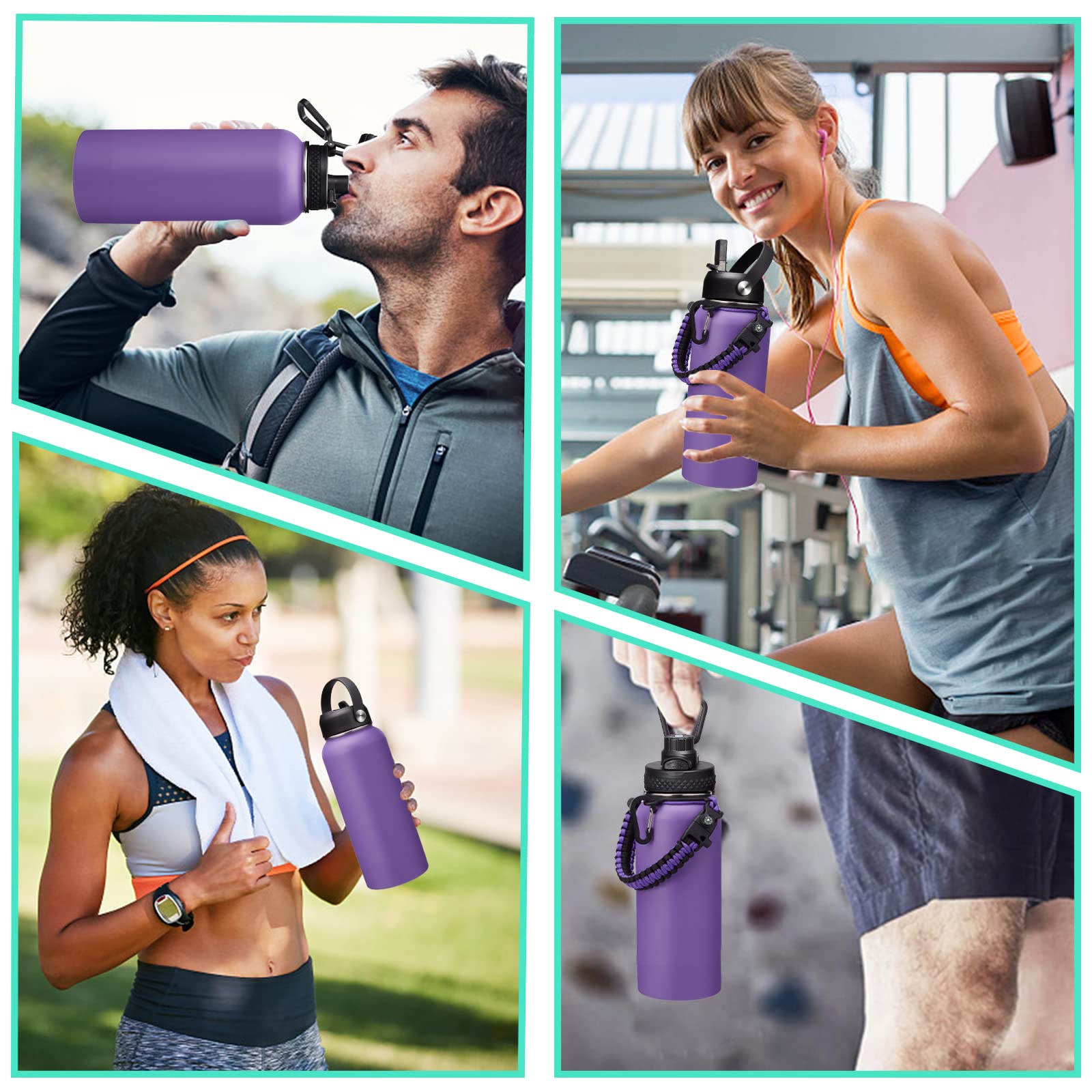 - SUPER JOYFUL COMBO: Buy 32 oz water bottles and get 9 accessories (2 x lids, 1 x survival paracord, 1 x carrying pouch, 1 x shoulder strap, 1 x protective cup mat, 2 x straws, 1 x straw brush). WITH A LIFETIME GUARANTEE, these thermal water bottles are perfect gifts for using at home, work, school, road trips, hiking, sporting events, or just hanging out