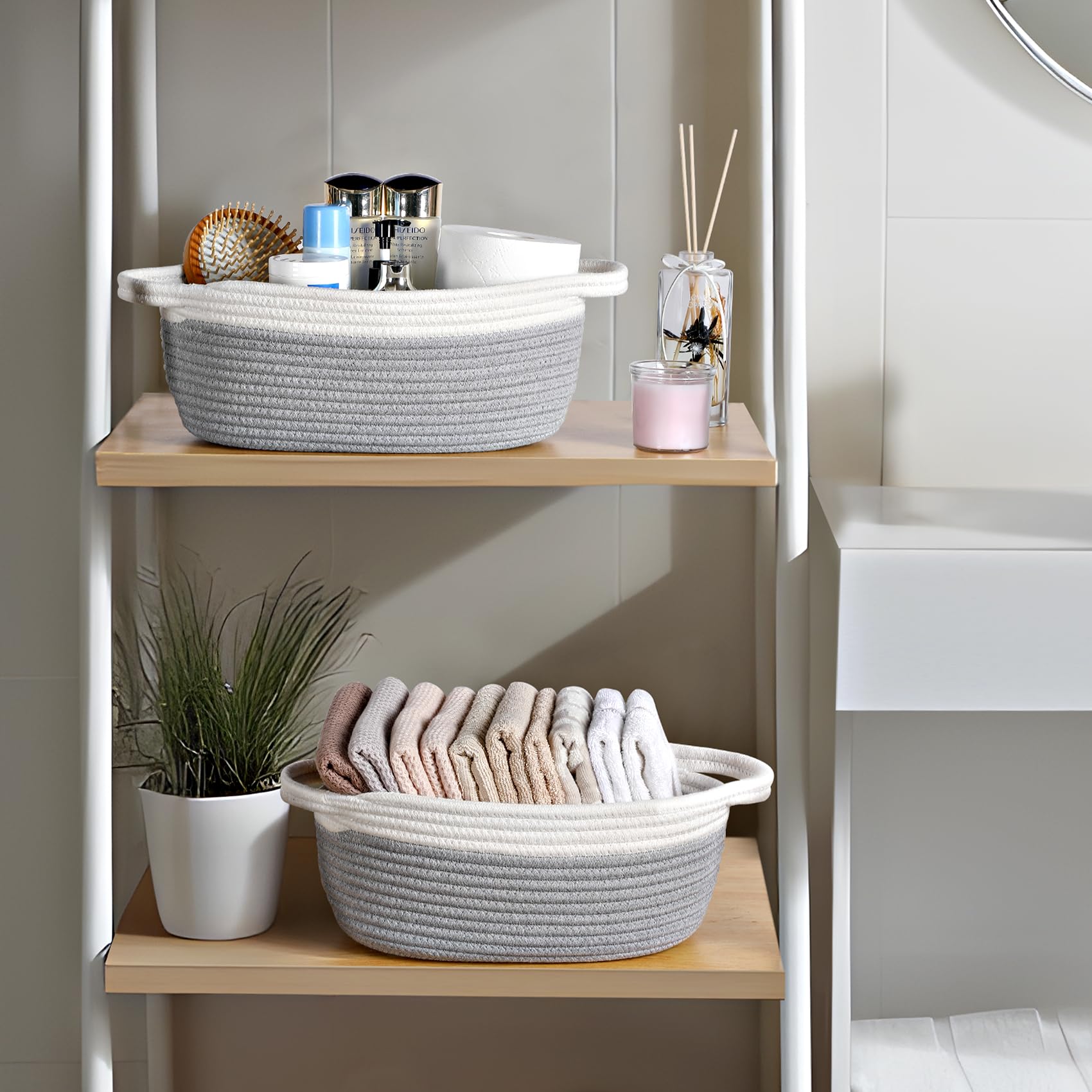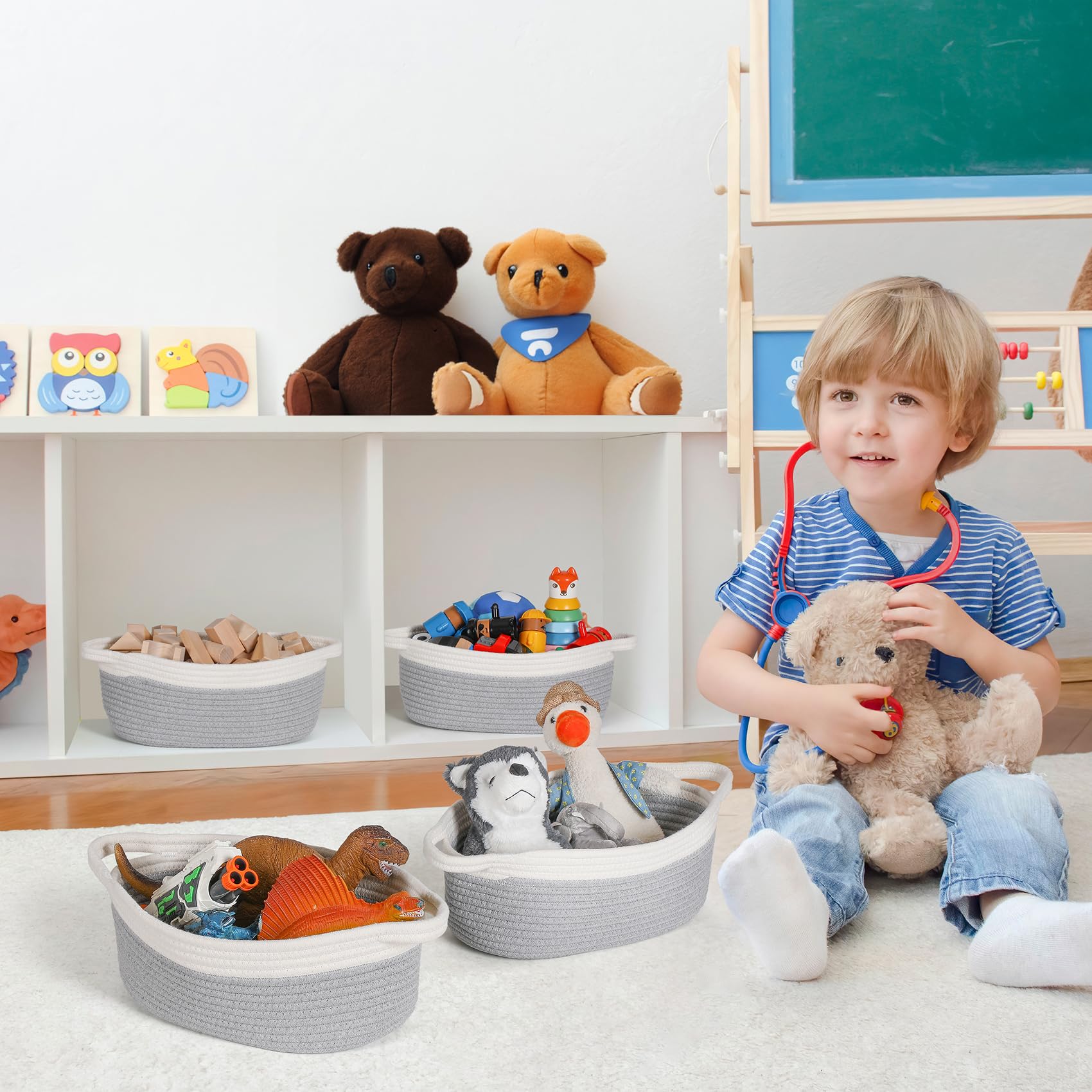 4 Pack Small Woven Basket with Handles, Cotton Rope Room Shelf Storage Basket, Cute Baby Gift Basket for Nursery, Bedroom - Cat Dog Toys Basket, Empty Decorative Gift Chest Box, All 12"x 8"x 5",Grey
