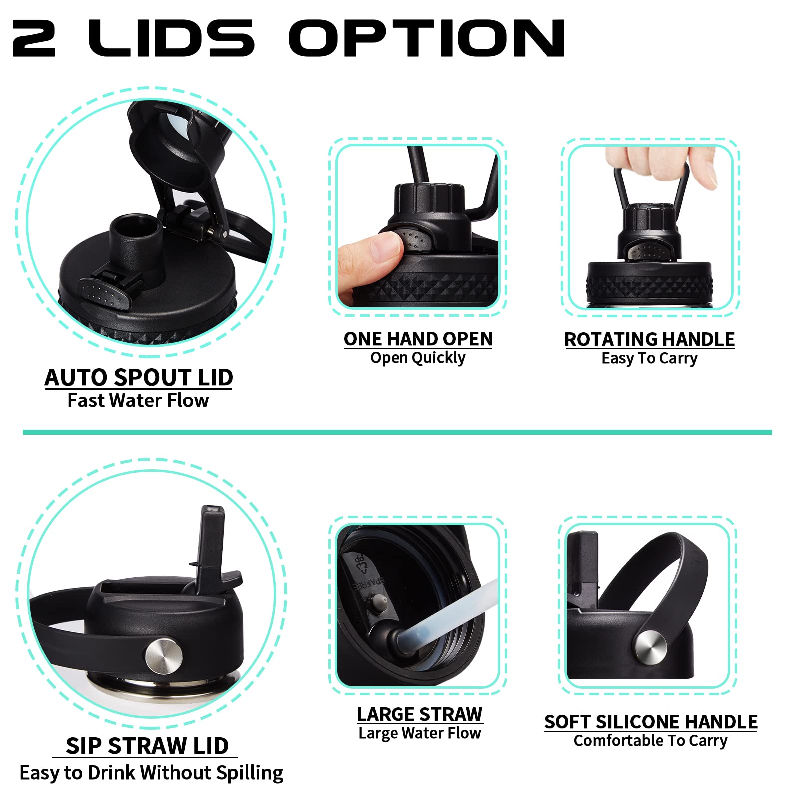 - 2 LIDS—100% Leak Proof: the auto spout cap & straw lid provide your different drinking experience. The ONE-HAND operation pop-up spout lid for convenient enjoy your fast water flow. The SPILL-PROOF straw lid with high flow rate & BPA free. Both 2 lids design with a sturdy handle, making the insulated water bottle more convenient to carry