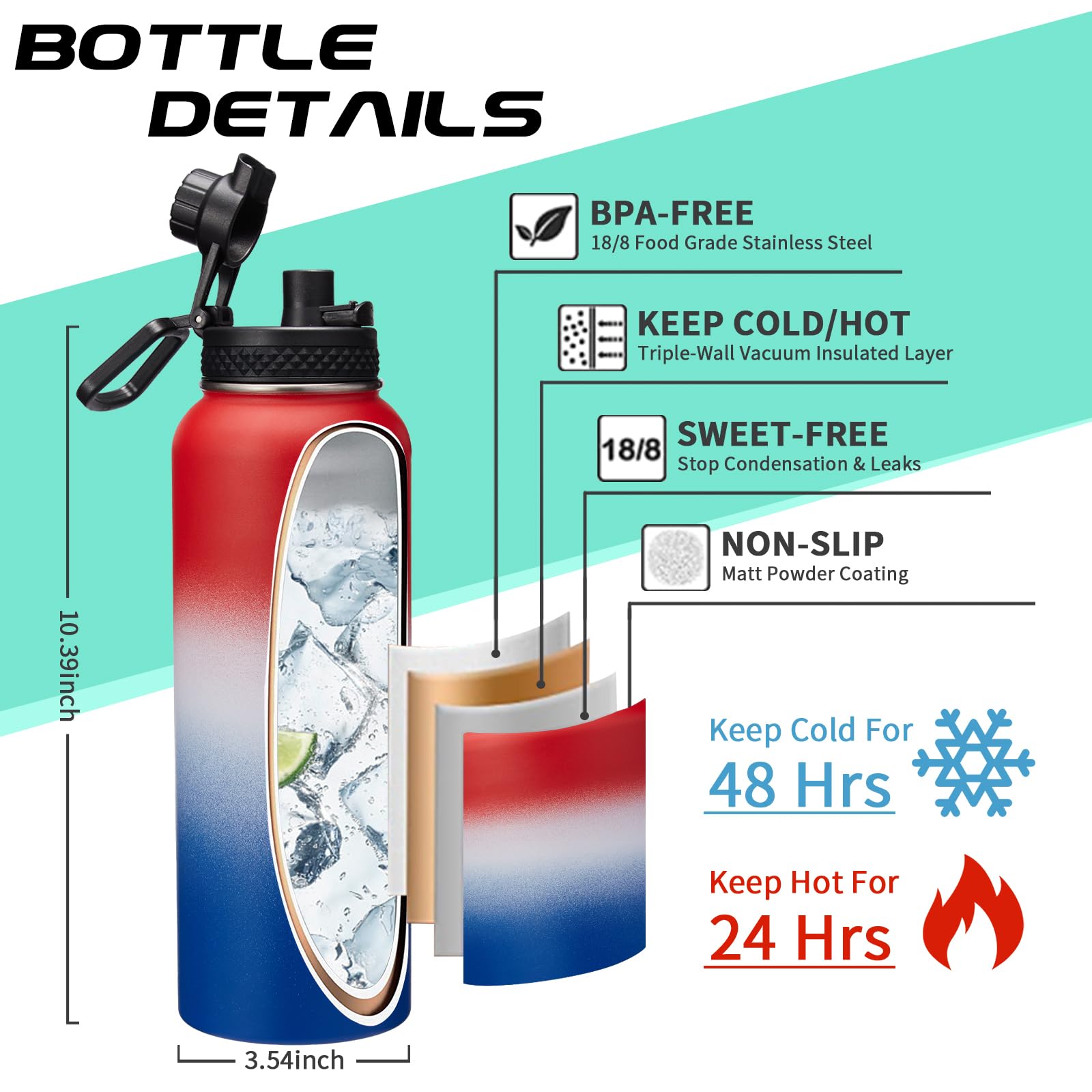 - QUALITY—Latest Vacuum Insulated: metal water bottle featuring double-wall & food-grade 18/8 stainless steel with superior insulation & anti-condensation, keeping your beverages stay ICE COLD for 48-Hours & HOT for 24-Hours for a fresh taste. In addition, the outer layer with non-slip powder coating ensures drinking bottles won't sweat & that keeps it from slipping