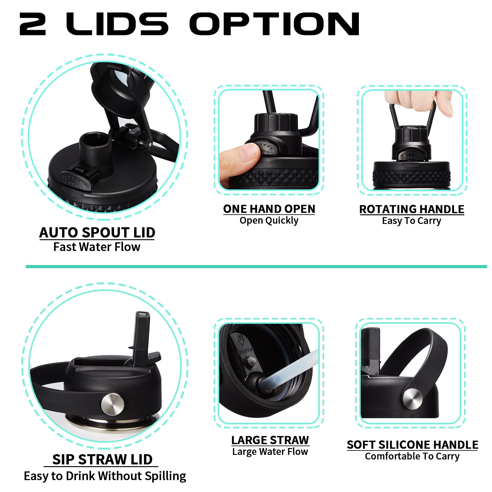 - 2 LIDS—100% Leak Proof: the auto spout cap & straw lid provide your different drinking experience. The ONE-HAND operation pop-up spout lid for convenient enjoy your fast water flow. The SPILL-PROOF straw lid with high flow rate & BPA free. Both 2 lids design with a sturdy handle, making the thermo water bottle more convenient to carry