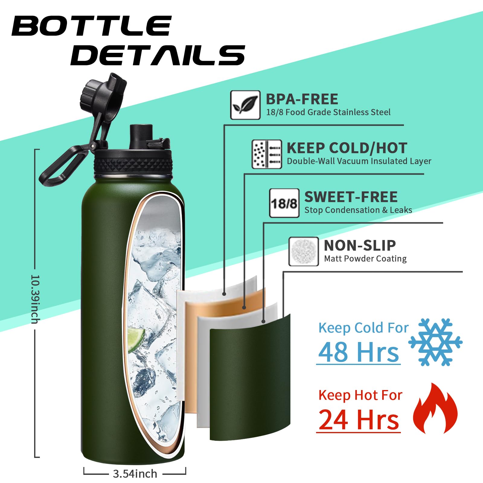 - QUALITY—Latest Vacuum Insulated: stainless steel water bottles with straw featuring double-wall & food-grade 18/8 stainless steel with superior insulation & anti-condensation, keeping your beverages stay ICE COLD for 48-Hours & HOT for 24-Hours for a fresh taste. In addition, the outer layer with non-slip powder