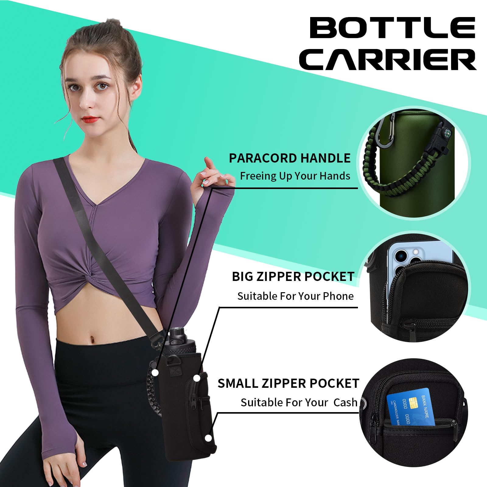- BOTTLE CARRIER BAG—Multifunctional: The water bottle carrier with storage made with neoprene material provide extra protect & insulate for your travel water bottle. It has 2 zippered pockets to hold your cards, keys and phones of any size, which is helpful if you have a lot to carry on one trip