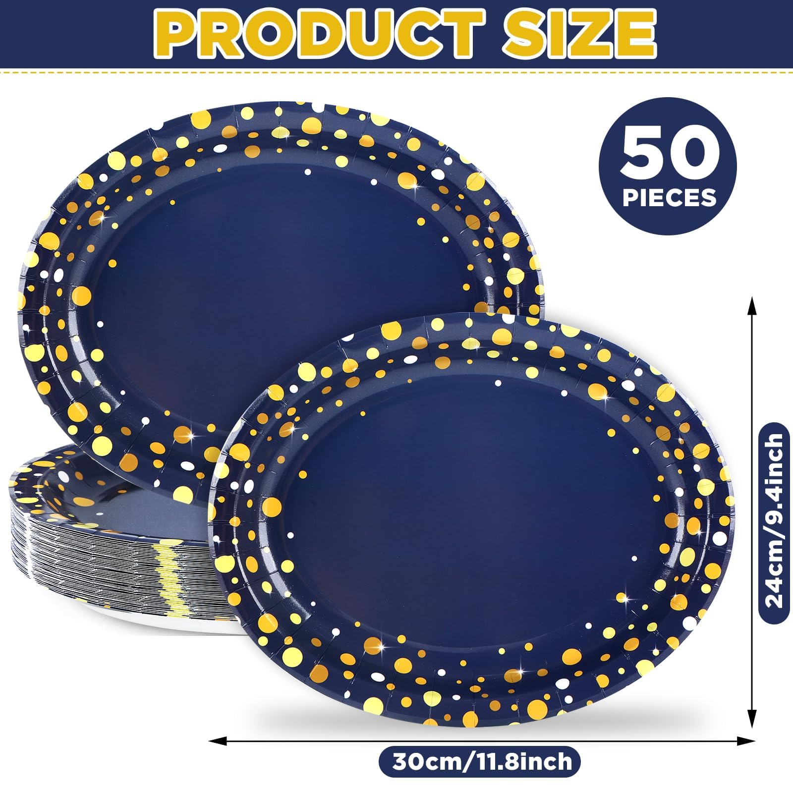 50Pcs Blue and Gold Party Supplies Large Gold Dot on Blue Paper Plates Oval Dinner Plates Disposable Party Tableware for Birthday Decorations Graduation Baby Showers Wedding Holiday Retirement