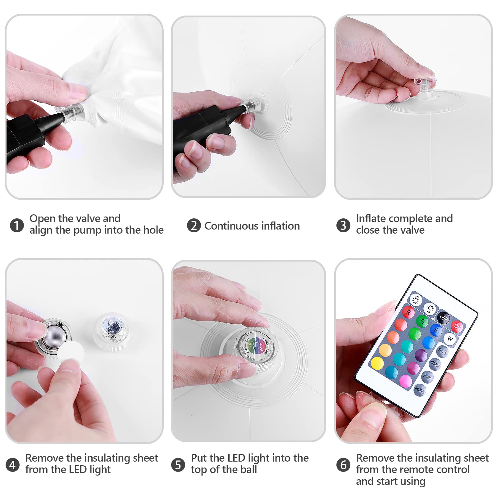 - 【Easy to Play】Open the valve of the bladder and align the pump with the hole (pump not included). Close the valve when inflation is complete. Remove the insulating sheet from the LED light module and the remote control. Put an LED light on top of the ball and you're ready to play happily. Perfect for pool toys and decorative lights.