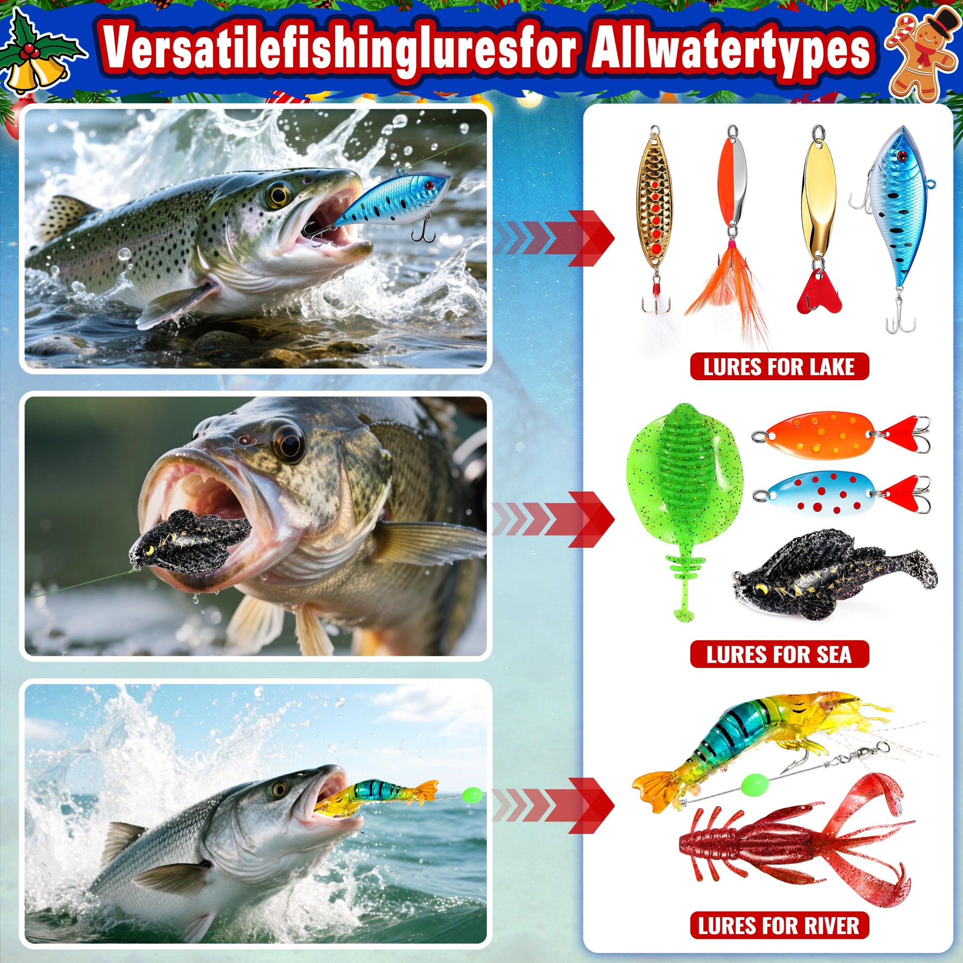 - 【Perfect for Various Fishing Scenarios】 Whether you're casting in freshwater lakes, and rivers, or challenging the waves in saltwater environments, our fishing lures are designed to excel. Specifically crafted for trout and bass fishing, these baits deliver outstanding performance. This is the ultimate 2025 advent calendar fishing gifts for adult men who love the excitement of fishing in diverse waters, from serene lakes and flowing rivers to the expansive ocean.