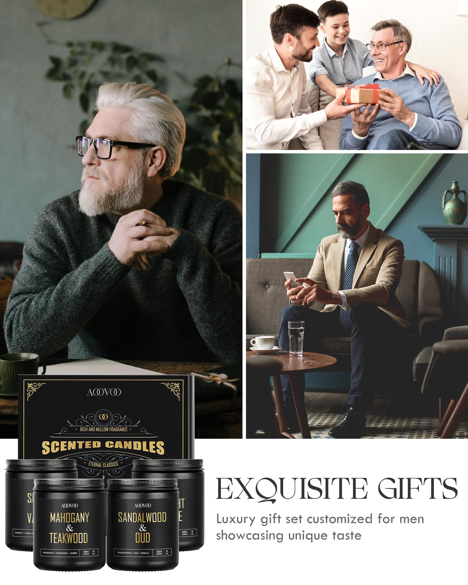 AOOVOO Scented Candles for Men - 4 Pack Candles for Home Scented, 36oz Soy Wax, 200 Hour Burn Time, Men Candle Set, Sandalwood Oud/Mahogany Teakwood/Smoke Vanilla/Jasmine Candle Set A