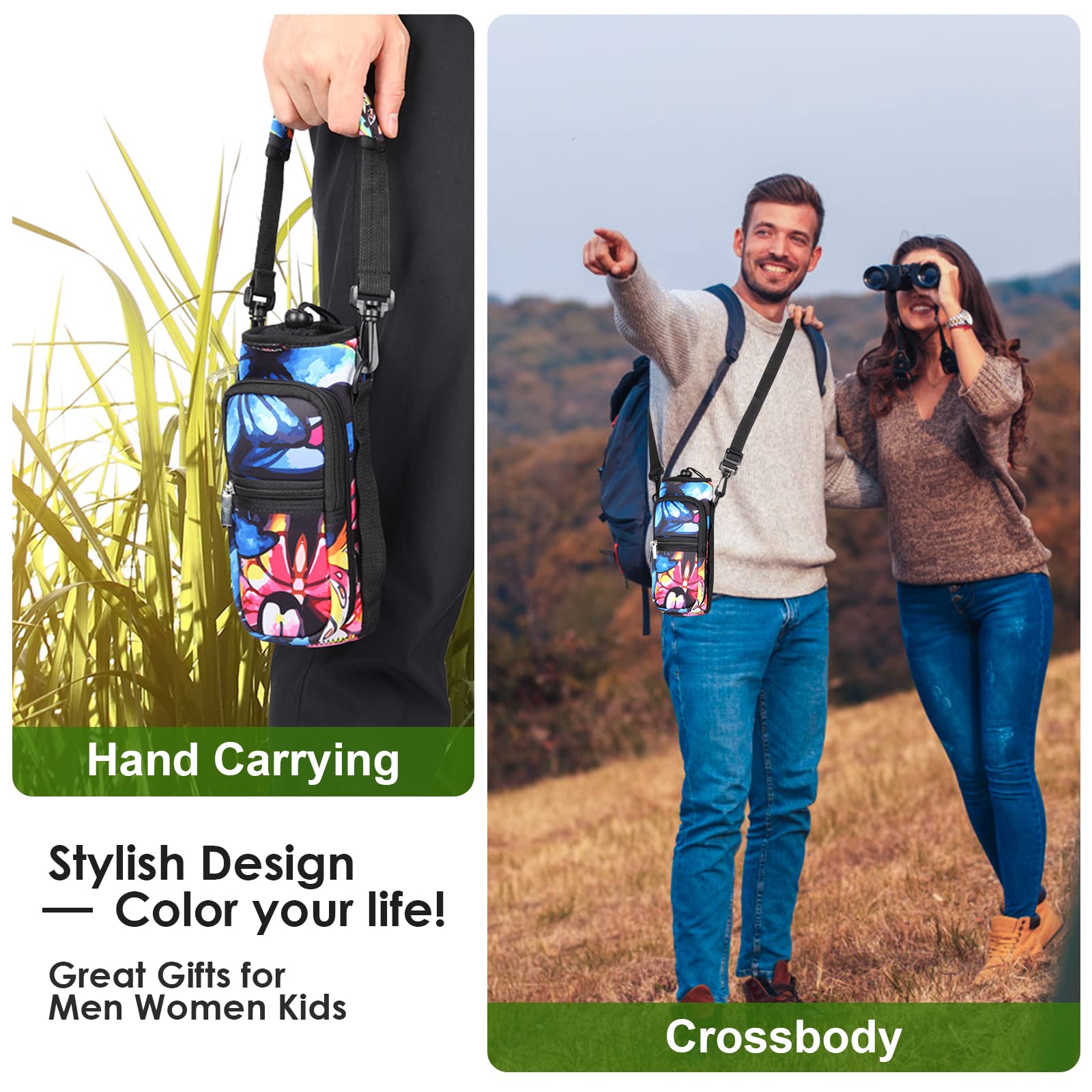 AUPET Water Bottle Sling Bag Sleeve Holder Carrier 25/32/40/64 oz,Insulated Crossbody Water Bottle Case Cover with Strap and Pockets for Men/Women Walking Hiking Camping (25oz, colorful butterfly)