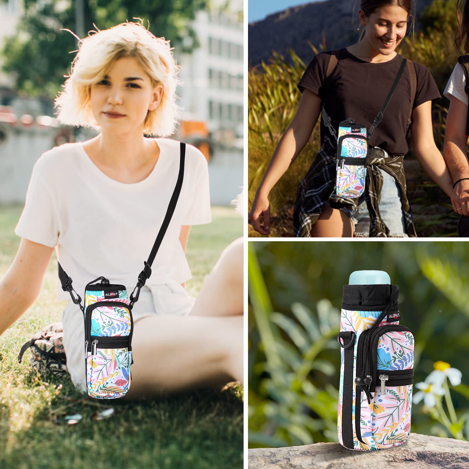 - GREAT FOR TEENS & ADULTS: Both adults and Kids can find great use in this AUPET water bottle carrier holder. Use it for walking,running,gym,cycling,hiking and more.with two zipper pockets for smartphone,cash,card keys and other small items.with the adjustable shoulder strap and the carring strap,it will fits all body types,you can wear over the shoulder, cross chest as a sling bag or just hand carring.