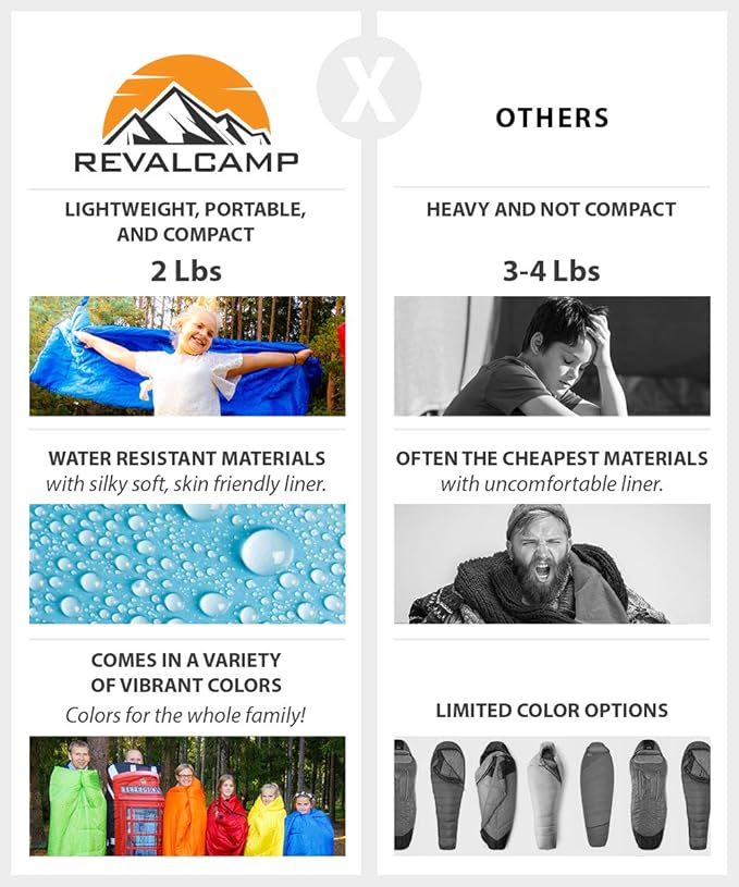 - ✅ RevalCamp Promise - we strongly stand behind the great craftsmanship of these sleeping bags. If you aren’t satisfied with the comfort, the size, the weight or for any reason at all then just let us know and we’ll be happy to give you a full-refund – no hassles, no delays, no questions asked.
