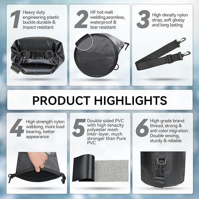 - Floatable and Trackable: The dry sack can float on water without sinking after being rolled up and buckled, so you can quickly track and retrieve your stuff. The D-ring and strap on the bag make it easy to attach to the boat, keeping your stuff always with you without getting lost, allowing you to enjoy thrilling outdoor activities with peace of mind.