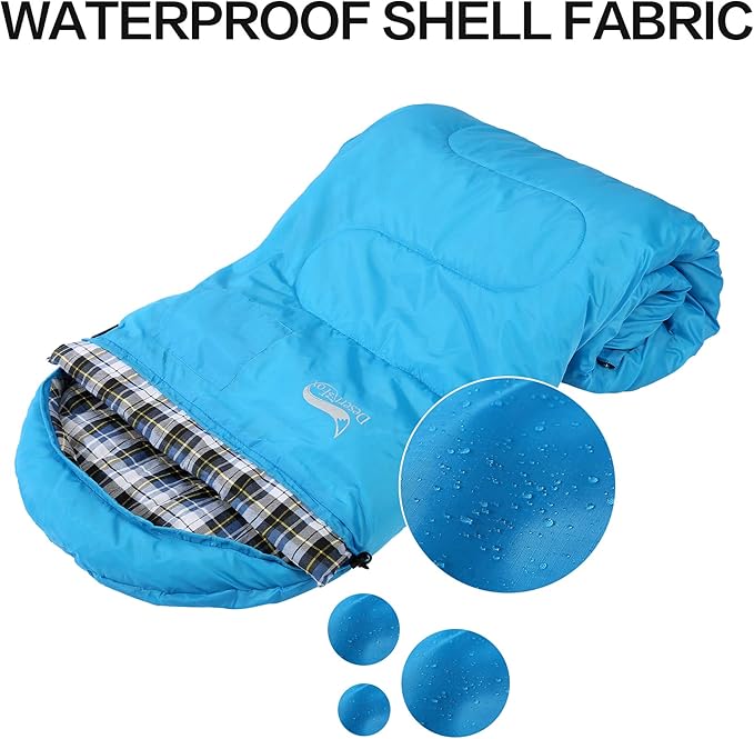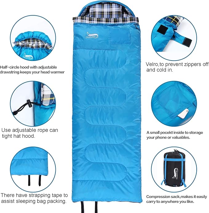 - Sleeping Bag for your Comfort -- After a full day outdoor activities, Desert&Fox sleeping bag can make you feel comfortable and warm, to relieve tiredness. Sleeping bag made of 210T tear-proof square Polyester because of it's high density and square design protect, it won't break even scratch by branch and stone. There has PU waterproof coating, can adapt to rain and snow weather, and always keep the inside warmth.