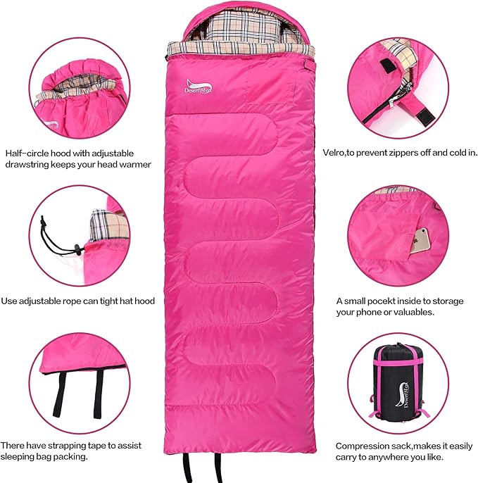 - Sleeping Bag for your Comfort -- After a full day outdoor activities, Desert&Fox sleeping bag can make you feel comfortable and warm, to relieve tiredness. Sleeping bag made of 210T tear-proof square Polyester because of it's high density and square design protect, it won't break even scratch by branch and stone. There has PU waterproof coating, can adapt to rain and snow weather, and always keep the inside warmth.