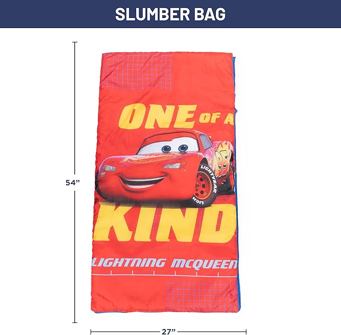- PERFECT FIT & FUN DESIGN - This Disney Pixar Cars slumber sack includes a slumber bag measuring 27' x 54' and drawstring sack measuring 14'x 19'. Featuring your favorite car, Lighting Mcqueen. This fun and colorful slumber sack is sure to be the center of attention at the next sleepover, take your child's bedtime adventure anywhere!