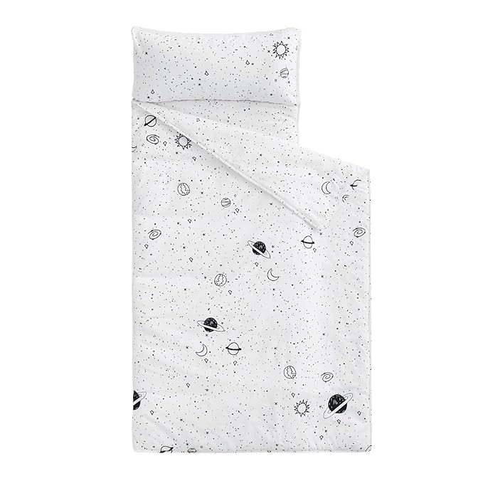 Wake In Cloud - Toddler Nap Mat with Pillow and Blanket, 100% Cotton Fabric, for Kids Boys Girls in Daycare Kindergarten Preschool, Roll Up Sleeping Bag, Black White Spaces, Standard