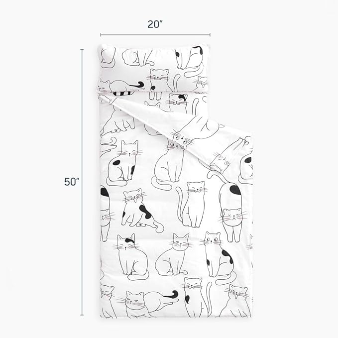 Wake In Cloud - Toddler Nap Mat with Pillow and Blanket, 100% Cotton Fabric, for Kids Boys Girls in Daycare Kindergarten Preschool, Roll Up Sleeping Bag, Black White Cats, Standard