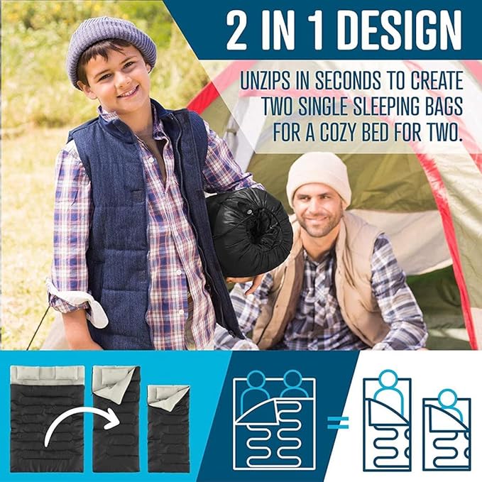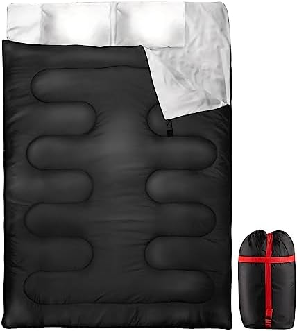 Zone Tech Double Camping Sleeping Bag with 2 Pillows – 3-4 Season Lightweight Waterproof Warm & Cool Weather Adult & Kids Sleeping Bag Converts into 2 Single -Camping, Hiking, & Outdoors
