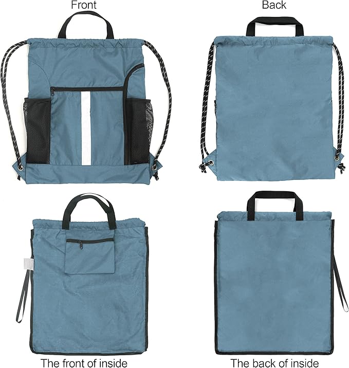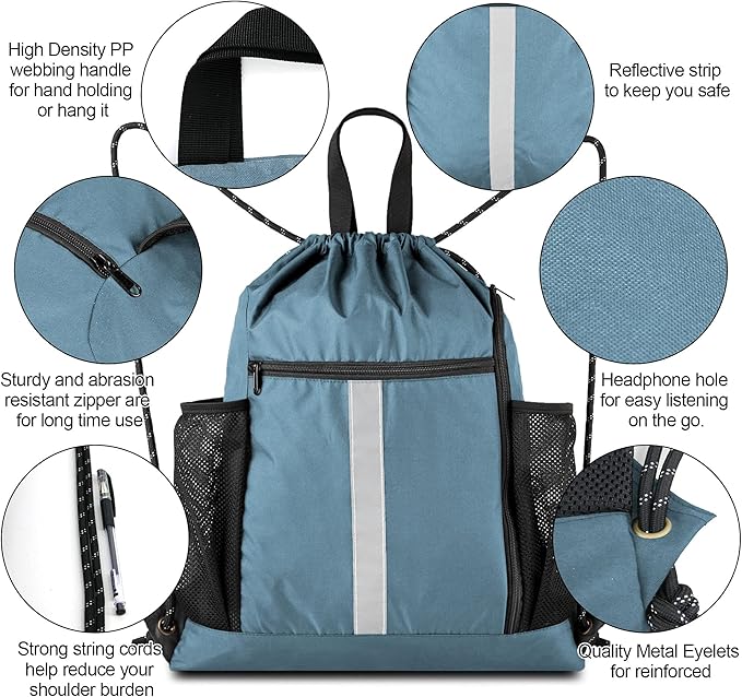 - Handle Design and Reflective Strip:Our blue drawstring gym bag has 2 handy carry handles allow for hand holding or hang it on the wall or door, very convenient for your use. Also the extra verticle reflective strips can enhance the high visibility to ensure your safe while in dark or dusk. Greatly reduce your chance of being hit at night.