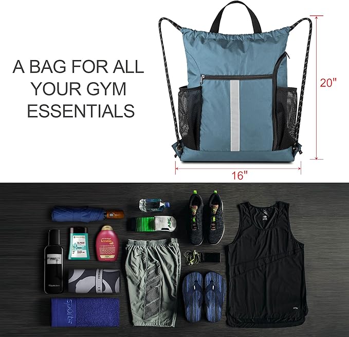 - Large Space: The main space of drawstring bag measures 16' x 19.5' which is big enough to hold a basketball, gym clothing, swim gear, sport towel and daily supplies. Perfect for gym, sports, trip, travel, camping, hiking, walking, running and more! It's also a great sports gift for men, women. Men and women can use it as a string gym backpack for women or a draw string sport bag.