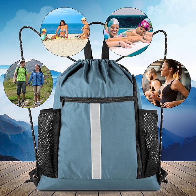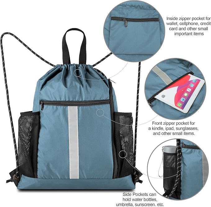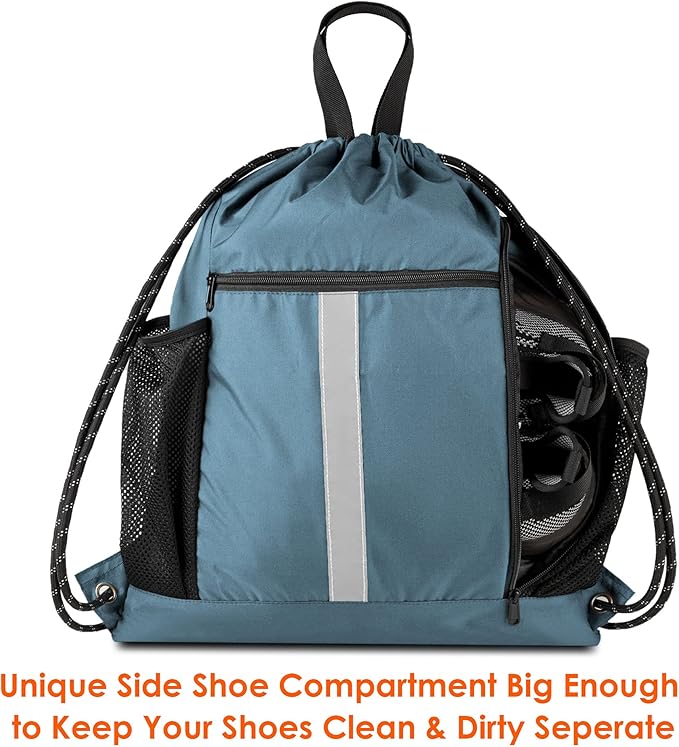 - Convenient Compartments: The big shoe compartment on the right side of sinch sack backpack can hold two pairs of shoes. The front zipper pocket is roomy to fit a kindle, iPad, sunglasses, and other small items. The inside pocket can hold small valuables such as wallet, cellphone, keys to avoid any pickpockets. And two mesh pockets can carry water bottles, umbrella, sunscreen. Etc. This drawstring backpack for men also can be used to store small items.