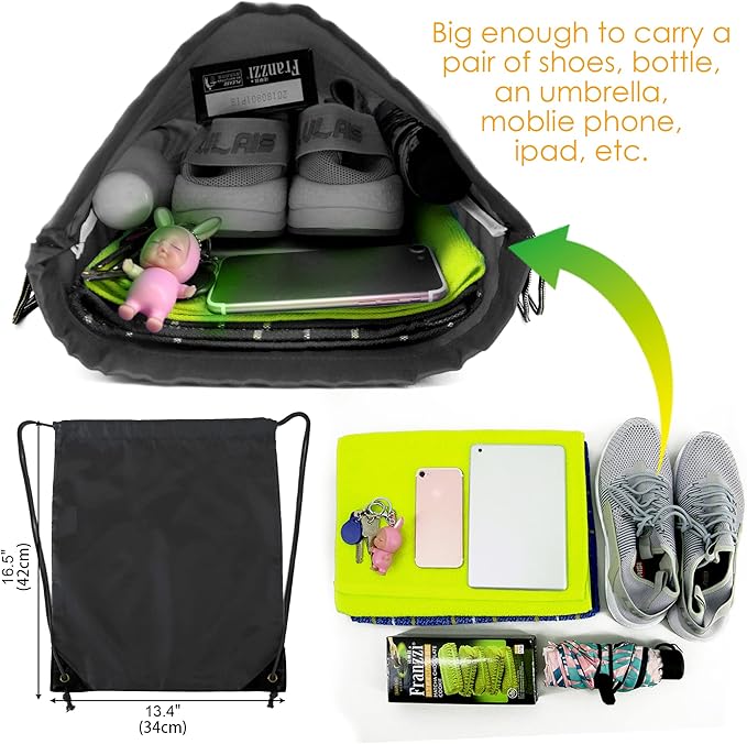 • 【FIT SIZE & LARGE CAPACITY】: The drawstring bags measure w 13.4 inches * h 16.26 inches which are big enough for carrying a variety of items, and perfect for everyday use. Great size for adults to carry around water bottles, clothes, sports shoes, accessories, small electronics, snacks, etc. Our gym backpack is also an ideal choice for a birthday party, fair prizes, carnival, construction giveaways, and so on.
