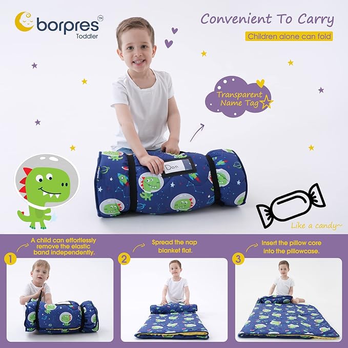 - PORTABLE AND LIGHTWEIGHT FOR TRAVEL: This toddler sleeping mat rolls up easily for travel, camping, and daycare. Foldable and designed for small children to carry themselves, it features a carry handle and name tag for on-the-go napping and resting