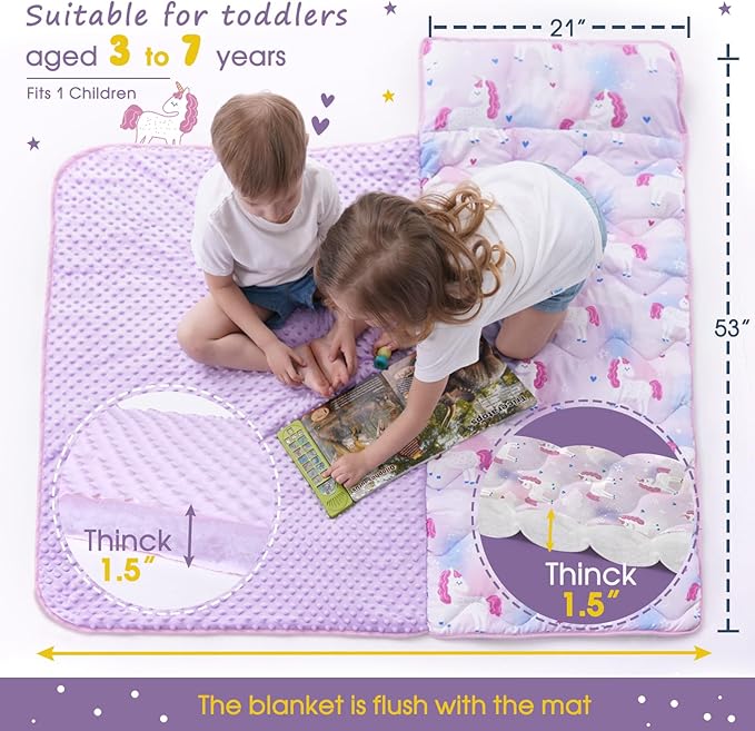 - VERSATILE USE FOR ALL AGES: Ideal for preschoolers, kindergarteners, and kids up to 7 years old, this nap mat suits the playroom, bedroom, living room, classroom, or camping.The portable, fluffy cushion provides a cozy and comfortable resting place