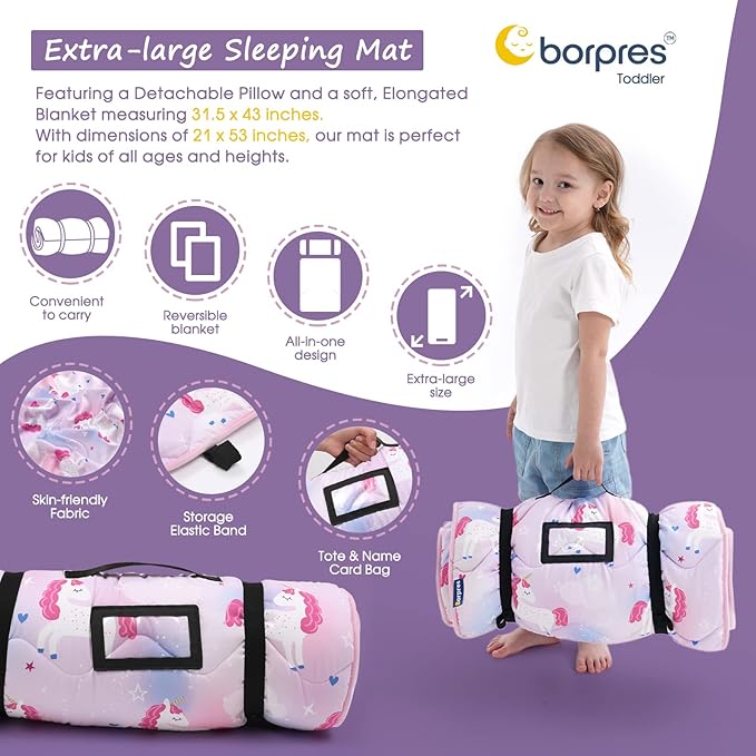 - PORTABLE AND LIGHTWEIGHT FOR TRAVEL: This toddler sleeping mat rolls up easily for travel, camping, and daycare. Foldable and designed for small children to carry themselves, it features a carry handle and name tag for on-the-go napping and resting