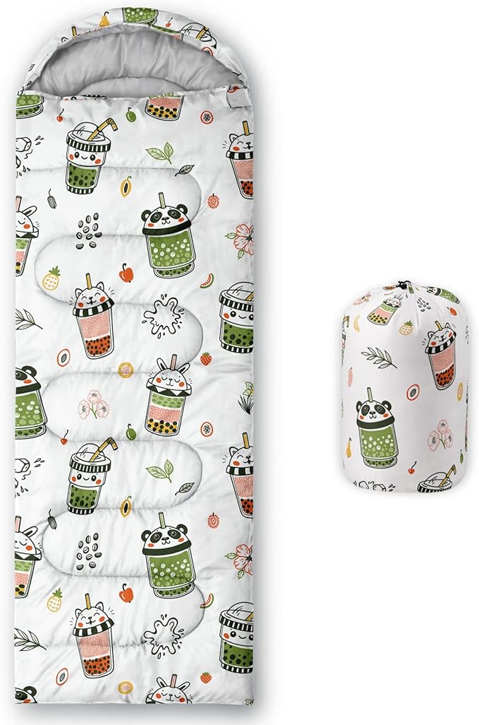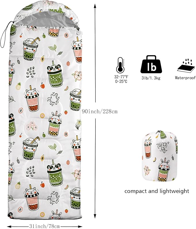- SUITABLE:The sleeping bag can be used for 3 Seasons.SIZE:90.5'L x 31.5'W Suggenal extreme temperature: 41 ℉ -77 ℉.Applicable in a variety of scenarios,such as Travel camping pajamas party,It's very suitable for you to travel with your children.Half-circle hood with adjustable drawstring,which can keep you warm and prevent your humidity