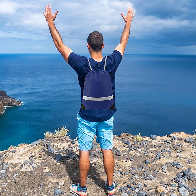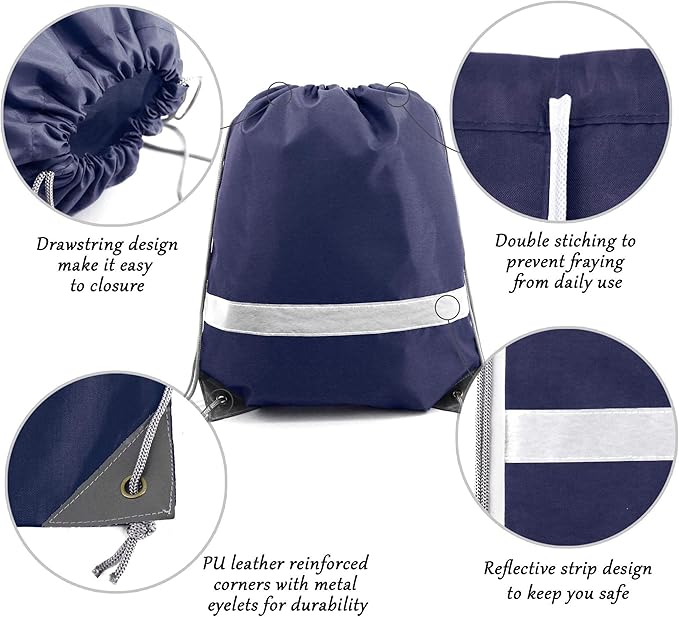 - 【STURDY & EXTRA REFLECTIVE STRIP】-- The bags are very sturdy and withstands daily wear and tear. Double stitches for all seams, making the bag is not easy to fall off and can last long. Our drawstring bags have PU leather reinforced corners, durable drawstring cords, and metal eyelets. These designs ensure that our drawstring bag is more durable. Also, the extra reflective strip can enhance the high visibility to ensure your safety while outdoor in the dark or dusk.