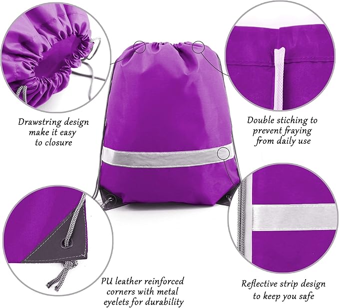 - 【STURDY & EXTRA REFLECTIVE STRIP】-- The bags are very sturdy and withstands daily wear and tear. Double stitches for all seams, making the bag is not easy to fall off and can last long. Our drawstring bags have PU leather reinforced corners, durable drawstring cords, and metal eyelets. These designs ensure that our drawstring bag is more durable. Also, the extra reflective strip can enhance the high visibility to ensure your safety while outdoor in the dark or dusk.