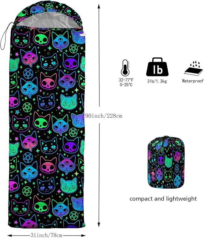 Axolotl Colorful Cats 3 Season Sleeping Bag for Kids, Girls, Teens - Warm and Cool Weather Pet Animal Theme, Waterproof Lightweight for Traveling, Outdoors Camping Equipment