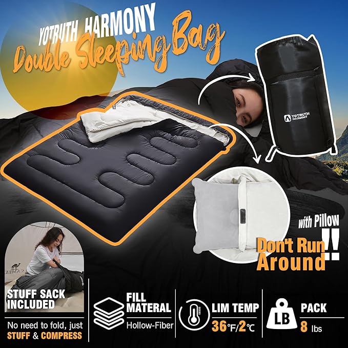 - 【Harmony series】The Harmony series camping sleeping bags is designed for family or couple car camping, sacrificing portability for enhanced comfort, allowing you to create a cozy sleep system for your loved ones during camping. Our sleeping bag is a camping essential for car camping.Protected by the yotruth Limited Lifetime Warranty.