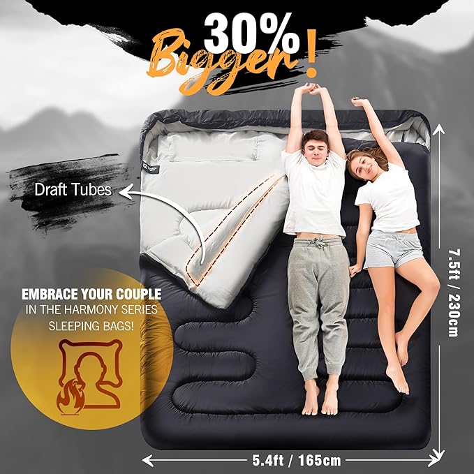 - 【Larger Size】Measuring 230cm in length and 165cm in width, ditch those constricting double sleeping bags for adults and enjoy a spacious and comfortable experience with your family in the Harmony sleeping bags for adults 2 person. We've designed two L-shaped zippers, allowing you to fully open the sleeping bag for more space.