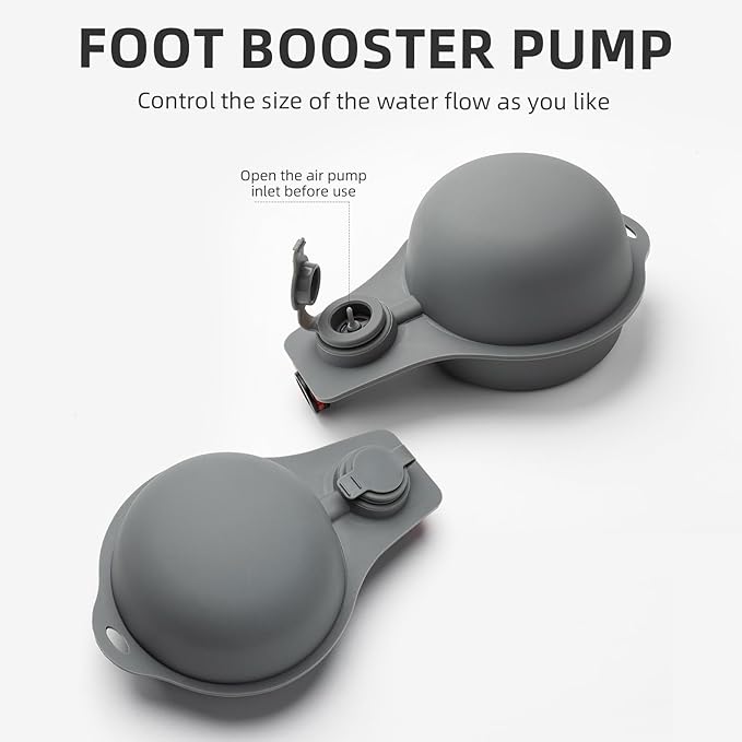 - Upgraded Foot Pump Design: The foot pump of the camping shower bag is a added feature over other ordinary shower bag. The foot pump pressurizes the water tank to give a long powerful spray and get a comfortable high-volume rinse. Stepping on foot pump a few times can hold water for 30 seconds, and a whole tank can last about 6 minutes shower