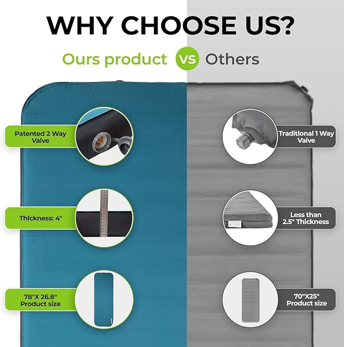 - Superior Support & Ergonomic Comfort: Engineered with a premium 10cm thick high-resilience foam core and 3D sidewall construction, this double self-inflating camping pad offers unmatched body support and ergonomic comfort. The horizontal perforation design reduces overall weight to 13.4 lbs while maintaining structural integrity, allowing the mattress to conform naturally to your back, hips, and shoulders—no more sagging or pressure points. Sleep like you're at home, even in the great outdoors.