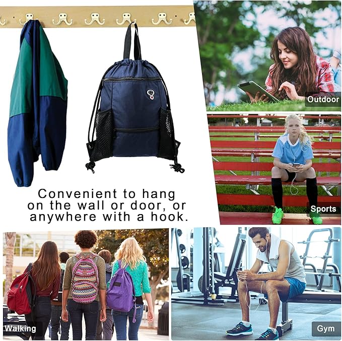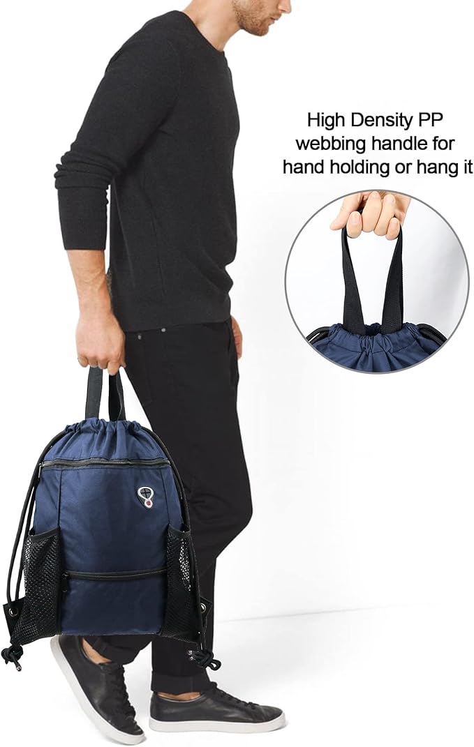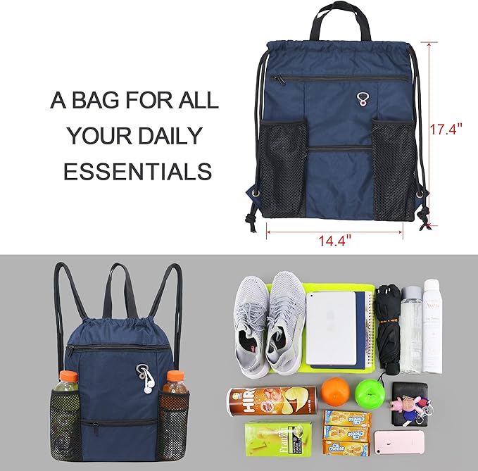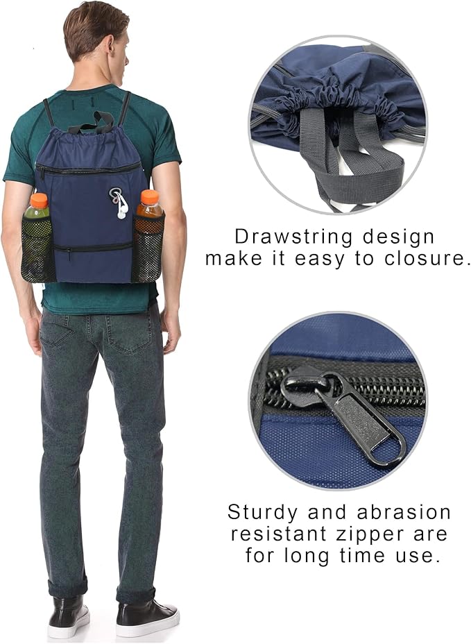 - CONVENIENT MULTI POCKETS:The front large zipper pocket of this drawstring gym backpack for kindle, ipadand so on, the front small zipper pocket great for towel,sunglasses and other small items. Besides, two sides mesh pockets allow you to place a water bottle or umbrella easily. And the inside zipper pocket can hold small valuables such as wallet, cellphone, credit card. etc. This is a drawstring bag for all your daily essentials.