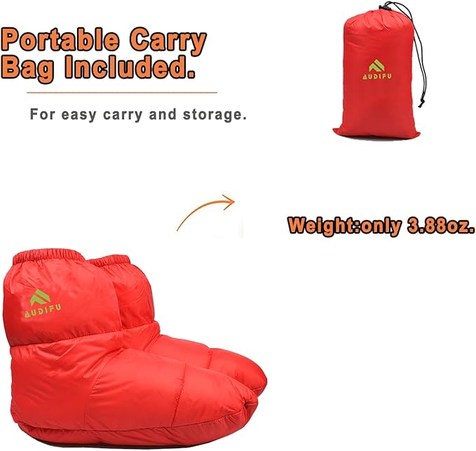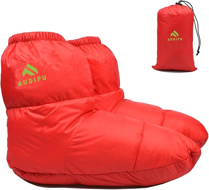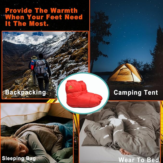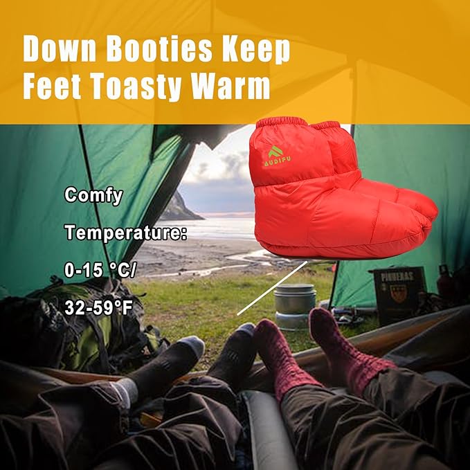 - Great Gift for Campers/Backpackers. Warm up down booties keep feet toasty warm while sleeping in camping sleeping bag, camp tent, RV or around the house/bed/chair! Great for sitting/sleeping/laying down.