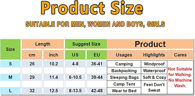 - DOWN BOOTIES WARM SOCK: Super Value Premium Warm Up Down Booties for Men and Women Keep Feet Toasty Warm While Sleeping In Camping Sleeping Bag, Camp Tent! Great for Sitting/Sleeping/Laying Down(Not For Walking).