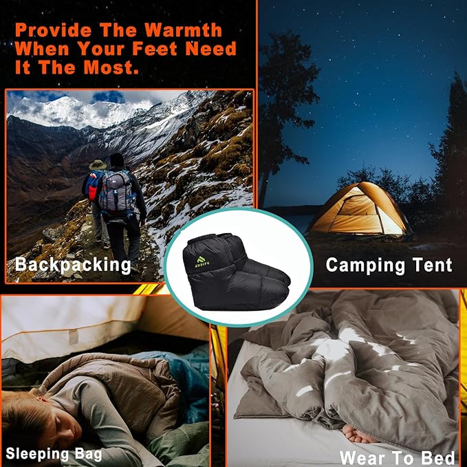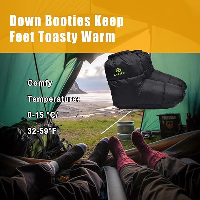 - Great Gift for Campers/Backpackers. Warm up down booties keep feet toasty warm while sleeping in camping sleeping bag, camp tent, RV or around the house/bed/chair! Great for sitting/sleeping/laying down.