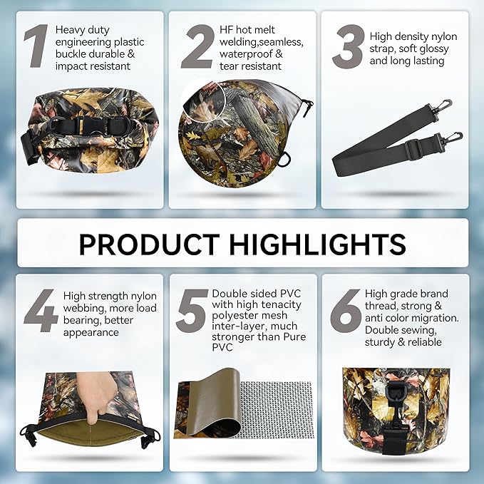 • Versatility: Its outstanding waterproof performance, durability and practical design make it a reliable companion on any water adventures, such as paddling, sailing, canoeing, surfing, river tubing, snowboarding, climbing, hunting, water park and beach trips. It can also be used as a simple bag for daily hiking or traveling during the rainy season.