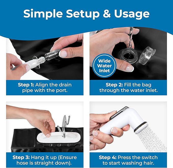 - Easy to Use: Simply fill the bag with warm water from any regular kitchen or bathroom faucet. The flexible water hose provides ample slack for easy maneuverability during the hair washing process, ensuring a hassle-free experience for caregivers.