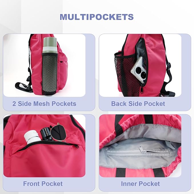 • Convenient Multi Pockets: The drawstring gym bag has a back side pocket, designed to keep your cell phone and wallet secure. The front zipper pocket offers easy access to keys or ID cards, eliminating the need for digging. Besides, two side mesh pockets allow you to place a water bottle, umbrella easily. Inside of sport bag, the zipper pocket can hold small valuables. Multiple Pockets help you to keep things to be placed by category, easy to be found.