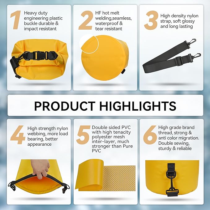 - Sturdy and Durable: Drybag is made of a ripstop tarpaulin that is resistant to wear, tear, puncture and remains flexible all year round. The seams are expertly welded and reinforced, strong and reliable. Heavy duty buckles, dense straps, secure stitching all enhance the bag’s overall strength. It won't wear easily even if it touches rocks and can be used for long time in harsh conditions, effectively keeping your gear dry, clean and safe.