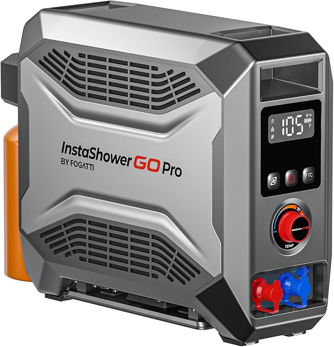FOGATTI Camping Shower Tent with InstaShower GO Pro Portable Water Heater and Carrying Bag