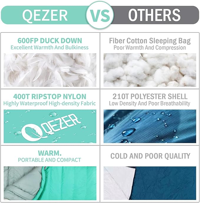 - 【 𝐒𝐀𝐓𝐈𝐒𝐅𝐀𝐂𝐓𝐈𝐎𝐍 𝐆𝐔𝐀𝐑𝐀𝐍𝐓𝐄𝐄 】QEZER always provides our customers with the best sleeping bag products and services with stylish design, premium down and more perfect outdoor functions. If you have any product questions, please contact us via Amazon and provide your order number, we will respond sincerely and do our best to keep you satisfied.